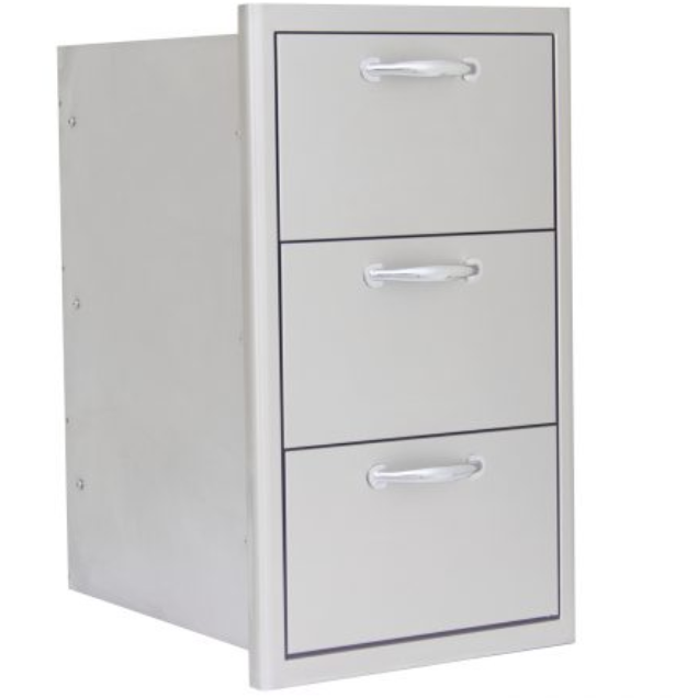 BLAZE 16 INCH TRIPLE ACCESS DRAWER. This Blaze Triple Access Drawer features clean design elements and quality construction using commercial grade 304 stainless steel that can stand up to the outdoor elements. Accented with curved handles and a unique, completely rounded bevel design, this drawer provides that quality touch to your outdoor kitchen or BBQ island. Blaze storage drawers are the perfect outdoor storage solution! Drawer 1 opening measurement 12 3/4 W x 7 3/4 H. Drawer 2 and 3 opening measurements 12 3/4 W x 9 1/4 H. As of March 15, 2016 — All Blaze cabinetry will feature a lifetime warranty. Product must be registered within thirty days for the warranty to apply.