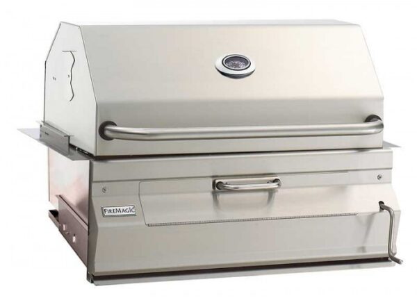 The Fire Magic Legacy charcoal slide in grill with smoker hood features all stainless steel construction, easy lift hand crank to adjust charcoal pan height and front loading access door. For slow smoking of meats, poultry or fish, the Fire Magic smoker hood offers versatility and flexibility. The smoker hood includes a warming rack, adjustable air shutters for controlling temperature and smoke, along with a hood mounted analog thermometer.